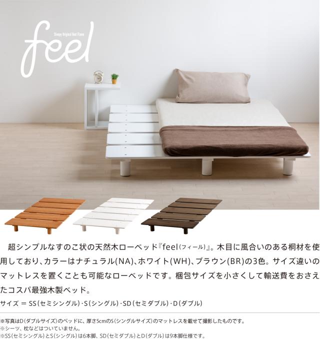 超シンプルなすのこ状の天然木ローベッド『feel(フィール)』。 木目に風合いのある桐材を使用しており、カラーはナチュラル(NA)、ホワイト(WH)、ブラウン(BR)の3色。 サイズ違いのマットレスを置くことも可能なローベッドです。 梱包サイズを小さくして輸送費をおさえたコスパ最強木製ベッド。