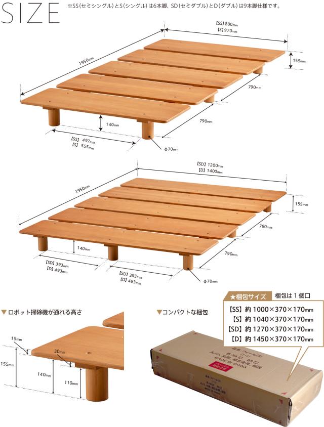 | サイズ | 【SS】セミシングル(6本脚) W800×D1950×H155 【S】シングル(6本脚) W970×D1950×H155 【SD】セミダブル時(9本脚) W1200×D1950×H155 【D】ダブル(9本脚) W1400×D1950×H155 |