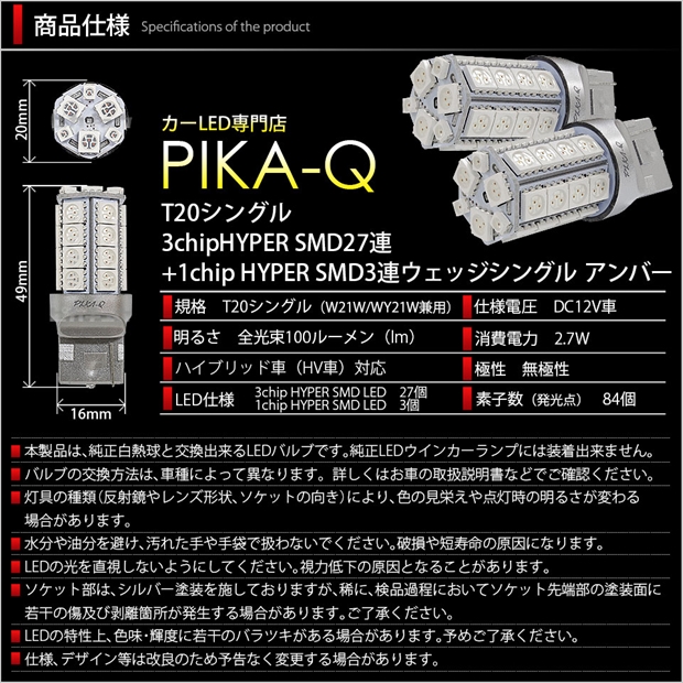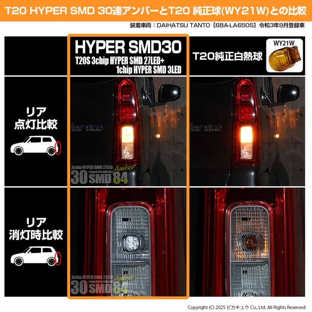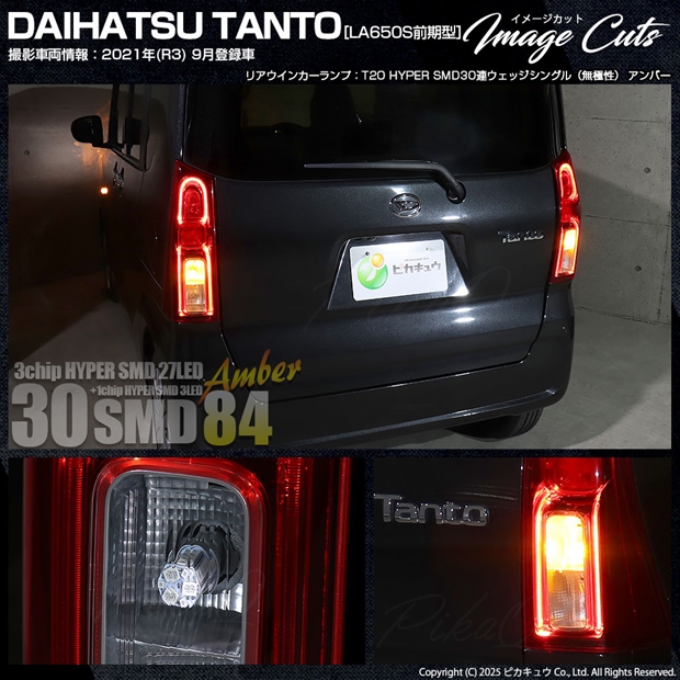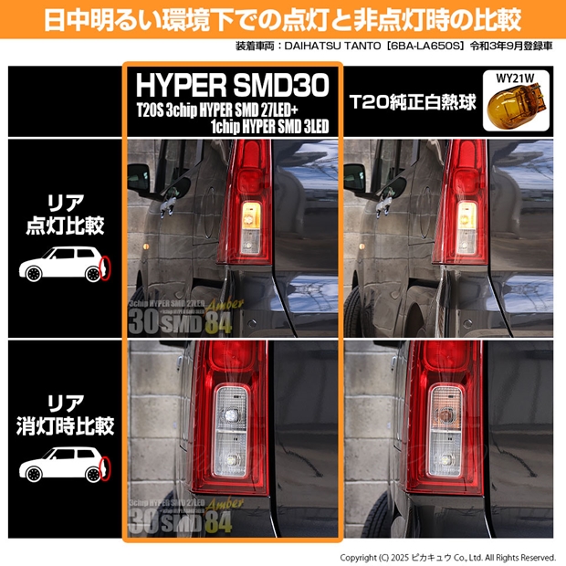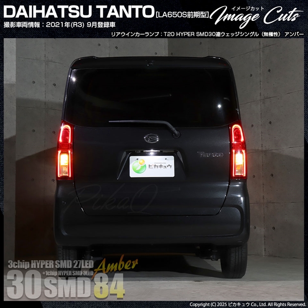 ピカキュウ,LED専門店,LEDバルブ,DC12V車,ハイブリッド車対応LEDバルブ,T20シングル,W21W/WY21W兼用,ウインカーランプ,アンバー,オレンジ,HYPER SMD30連ウェッジシングル球,ダイハツ,DAIHATSU,タント,TANTO,LA650S,LA660S,標準