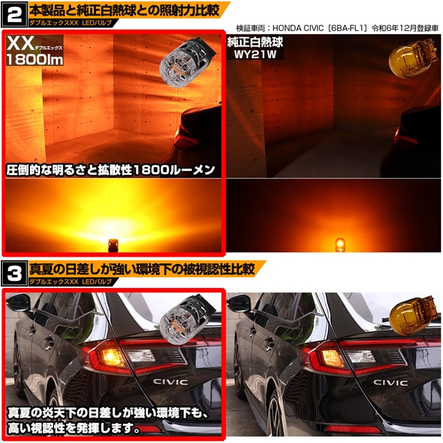 バルブ1個あたりの全光束は1800lm。ウインカーランプとして必要十分な光量を確保しているので夜間はもちろん日差しの強い日中においても高い被視認性を実現しています。