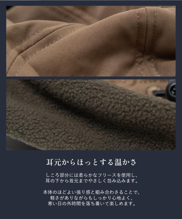 しころが耳元から首筋までふんわりと暖め、寒風からしっかりガード。