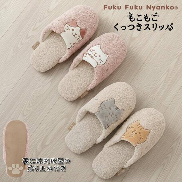 柔らかなモコモコ素材で仕立てられており、足を入れた瞬間ふわっと優しい履き心地。左右のスリッパをそっと近づけると、人気キャラクター「ふくふくにゃんこ」の“ほっぺた”がぴたっとくっつく可愛らしいデザインがポイントです。