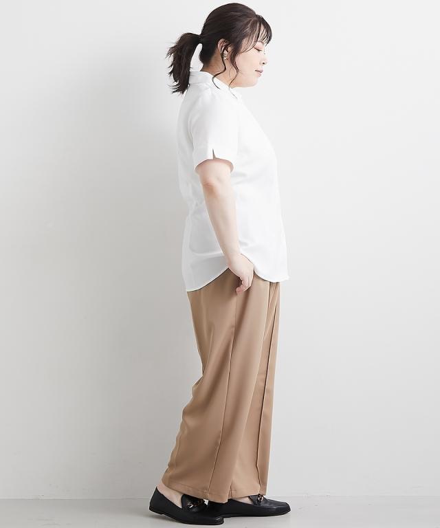 ☆着合わせしやすいシンプルなスキッパーカラーシャツの半袖タイプ☆・上品な光沢があり、肌触りもよいパウダーサテン素材のシャツ。・フェイスラインのすっきり見えを叶えるスキッパーカラーデザイン。・袖口にちょっとしたスリットデザインを施しているのがこっそりおしゃれ ・洗濯機で洗濯できるのでヘビロテ可能です。・抗菌防臭加工付きで胸元がちら見えしないように付いた隠しボタンも嬉しいポイント。