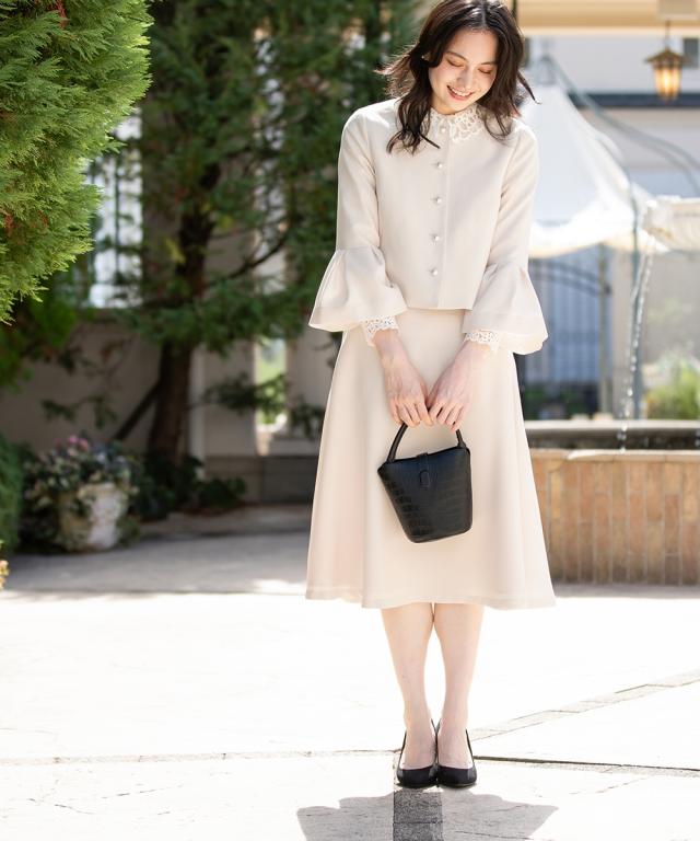 【入学式・卒業式・フォーマル】洗える パール釦使い袖タックデザインジャケット+フレアスカートセットアップ