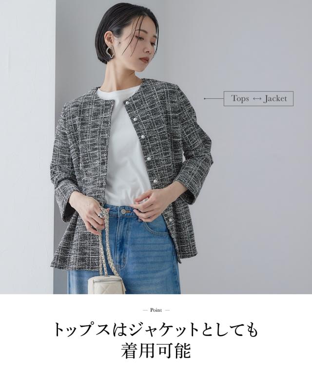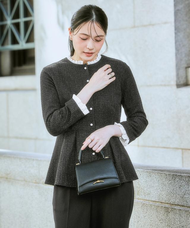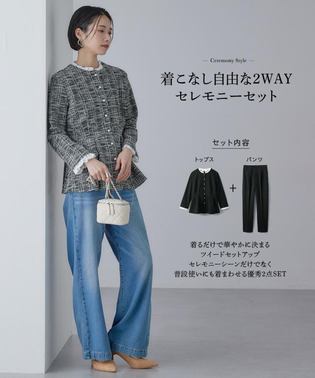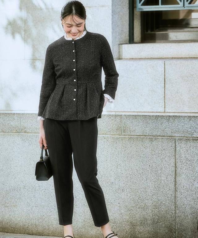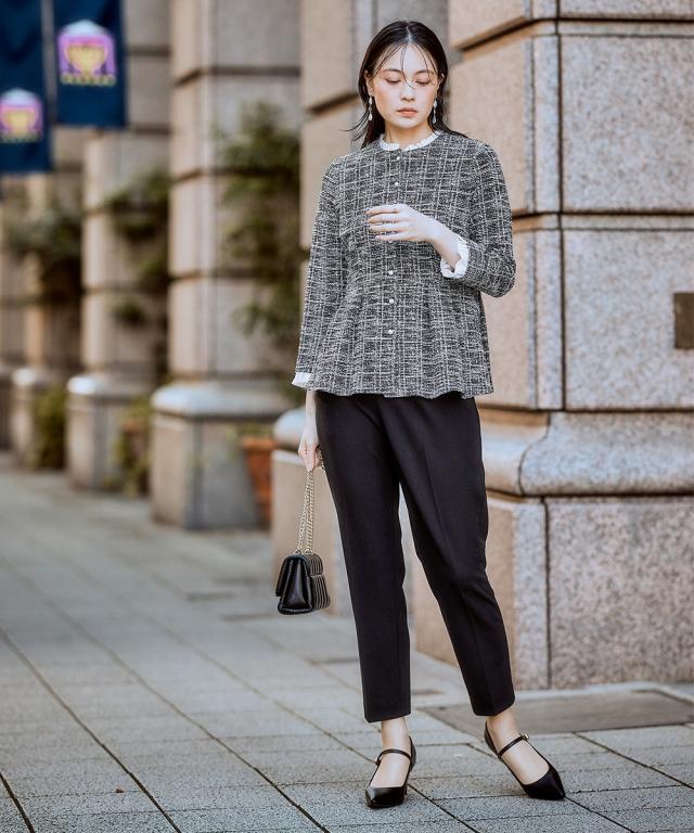 【入学式・卒業式・フォーマル】取り外せるフリル襟付カットツイードペプラムブラウス+ジャージーテーパードパンツセット