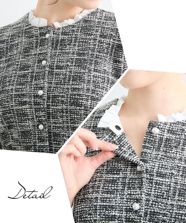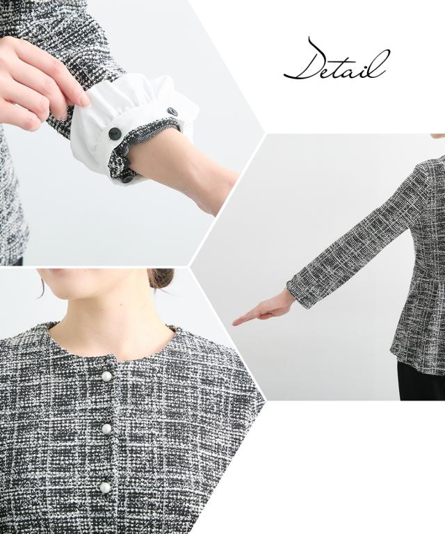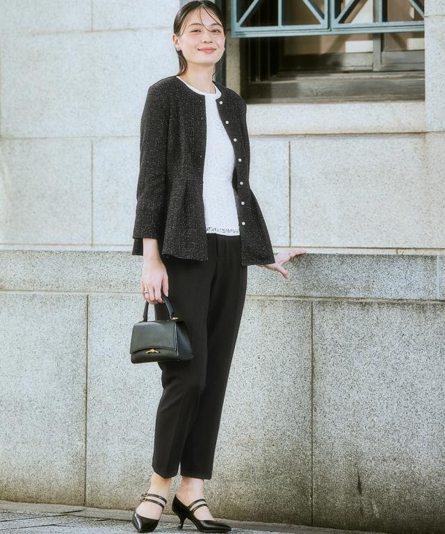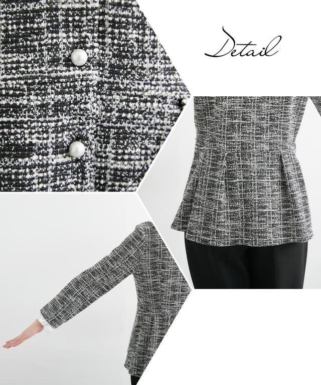 【入学式・卒業式・フォーマル】取り外せるフリル襟付カットツイードペプラムブラウス+ジャージーテーパードパンツセット