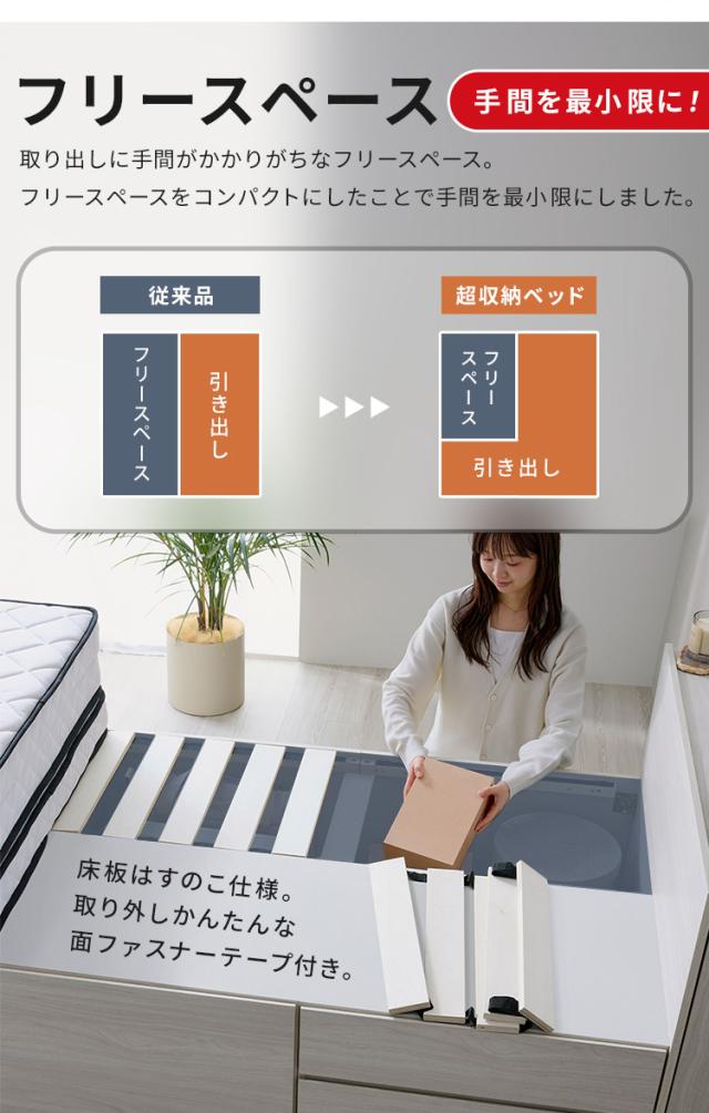 また、床板のすのこは片面仕様で取り外しが簡単なので、収納物の出し入れもスムーズです。
