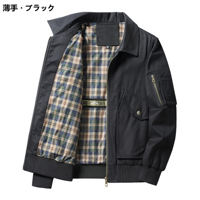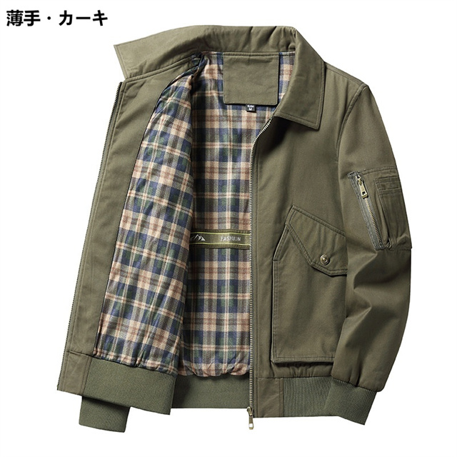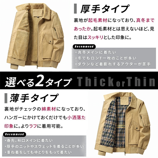 | 特徴 | すっきりしたシルエットでスタイリッシュな雰囲気のミリタリージャケット。 チェックの裏地がアクセントの薄手タイプと、起毛素材を採用した厚手タイプ、季節によって使い分けられる2タイプをご用意しました。 ボディラインに沿った立体的なシェイプと裾リブでメリハリのあるスタイルに。 サイドポケットインナーポケット付きで機能面も◎。 合わせやすい無地のボディで、さっと羽織るだけでコーデの役になれる一着です。 |