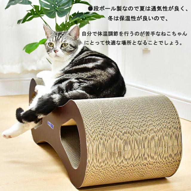 ●爪とぎ部分がねこちゃんの体にフィットする形状になっているので、ねこちゃんにとってリラックスできるくつろぎスポットにもなります。 ●段ボール製なので夏は通気性が良く、冬は保温性が良いので、自分で体温調節を行うのが苦手なねこちゃんにとって快適な場所となることでしょう。 ●厳選された「高品質コルゲート紙」を使用しており、爪を傷つけにくい・ひっかき傷に強い・変形しにくい・破片が出にくいという耐久性に優れた爪とぎです。