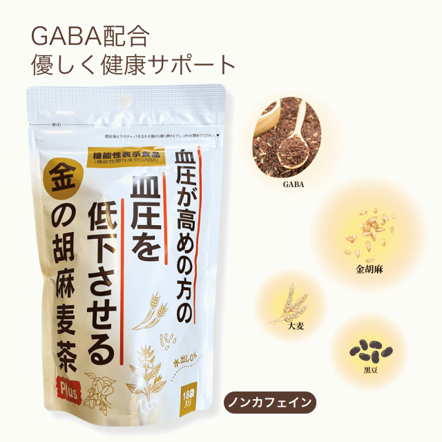 香ばしさとやさしさで、毎日の健康習慣に! **金の胡麻麦茶(ティーバッグタイプ)**は、国産大麦・黒豆(黒大豆)・甘茶・希少な金胡麻に加え、機能性関与成分「GABA(ギャバ)」をバランスよく配合。