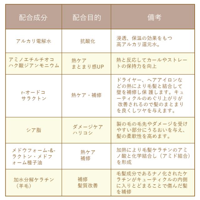 | 全成分 | *(ミネラルアルカリ還元水)、セタノール、ジメチコン、グリセリン、ステアロキシブロビルトリモニウムクロリド、ペペントリモニウムクロリド、シクロペンタシロキサン、PPG- 3カブリルエーテル、ステアリルアルコール、ステアルトリモニウムクロリド、ステアリン酸グリセリル、ヒマワリ種子油。ヒドロキシエチルセルロース、オレンジ果皮油、イランイラン花油、ペヘネスー20、香料、ジメチコノール、EDTA-2Na、ダイマージリノール酸(フィトステリル/インステアリル/セチル/ステアリル/ベヘニル)、シア、クエン酸Na、エタ ノール、クエン酸、セテアレスー7、BG、セテアレスー25、加水分解ケ ラチン(羊毛)、ムラサキ根エキス、トリ(カブリル酸/カプリン酸)グリセリル、(ラネス-40マレイン酸Na/スチレンスルホン酸)コポリマー、(ジヒドロキシメチルシリルブロポキシ)ヒドロキシプロピル加水分解シルク、PG、クオタニウム-18、イードコサラクトン、クオタニウム-33、コレステロール、セラミドNG、セラミドAG、セラミドNP、セラミドAP、セラミドEOP、イソプロバノール、ピスセテアリルアモジメチコン、安息香酸Na、フェノキシエタノール |