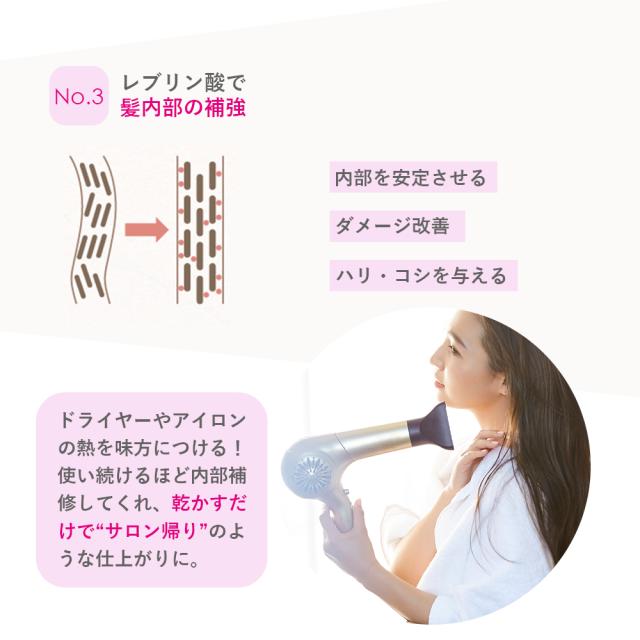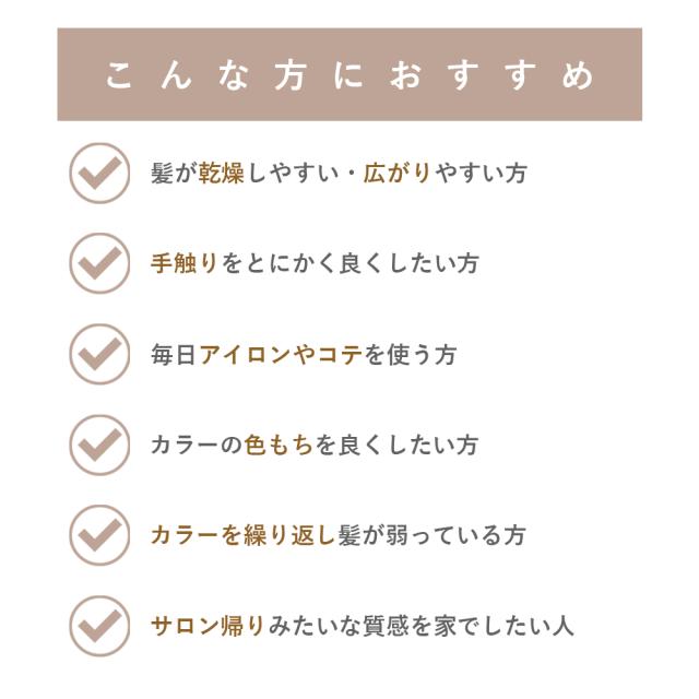 1.シャンプー後、髪の水気を取り、適量を手に取りなじませ毛先から髪全体に馴染ませます。 2.その後、お湯またはぬるま湯でよくすすいでください。 |