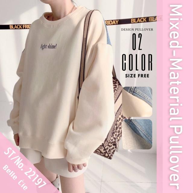 素材構成:(本体)スウェット裏起毛-ポリエステル100%、(配色)デニム-綿70%、ポリエステル30%