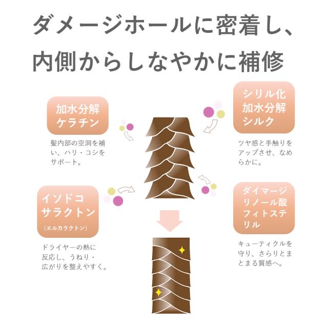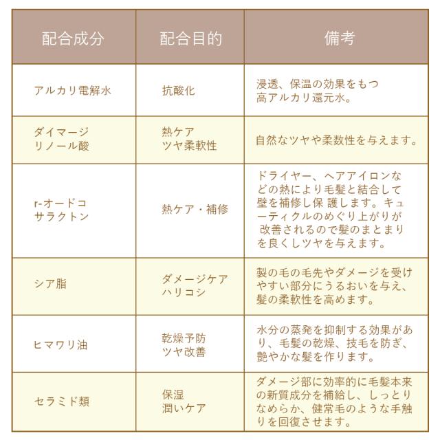 | 全成分 | *(ミネラルアルカリ還元水)、セタノール、ジメチコン、グリセリン、ステアロキシブロビルトリモニウムクロリド、ペペントリモニウムクロリド、シクロペンタシロキサン、PPG- 3カブリルエーテル、ステアリルアルコール、ステアルトリモニウムクロリド、ステアリン酸グリセリル、ヒマワリ種子油。ヒドロキシエチルセルロース、オレンジ果皮油、イランイラン花油、ペヘネスー20、香料、ジメチコノール、EDTA-2Na、ダイマージリノール酸(フィトステリル/インステアリル/セチル/ステアリル/ベヘニル)、シア、クエン酸Na、エタ ノール、クエン酸、セテアレスー7、BG、セテアレスー25、加水分解ケ ラチン(羊毛)、ムラサキ根エキス、トリ(カブリル酸/カプリン酸)グリセリル、(ラネス-40マレイン酸Na/スチレンスルホン酸)コポリマー、(ジヒドロキシメチルシリルブロポキシ)ヒドロキシプロピル加水分解シルク、PG、クオタニウム-18、イードコサラクトン、クオタニウム-33、コレステロール、セラミドNG、セラミドAG、セラミドNP、セラミドAP、セラミドEOP、イソプロバノール、ピスセテアリルアモジメチコン、安息香酸Na、フェノキシエタノール |