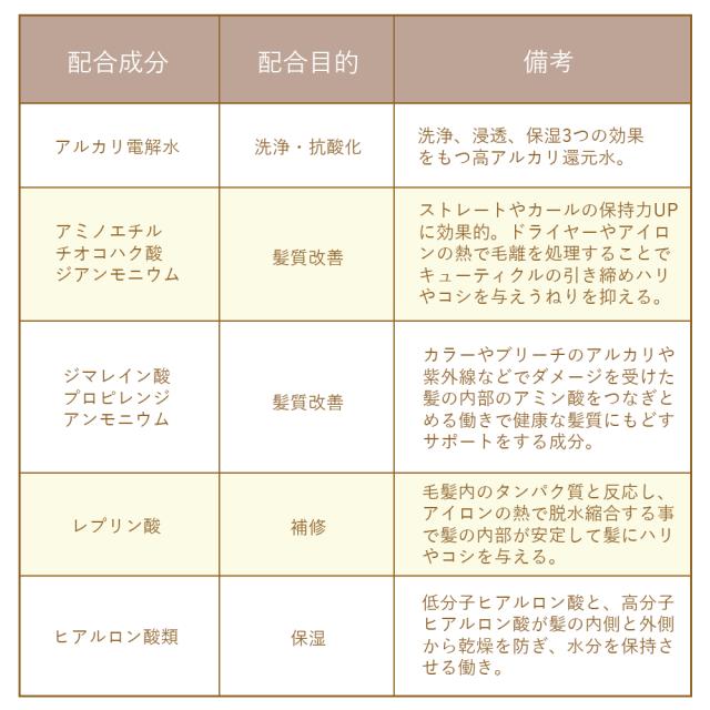 | 全成分 | 水(ミネラルアルカリ還元水)、アシル(C12.14)アスパラギン酸TEA、ラウラミドプロビルベタイン、コカミドメチルMEA、コカミドプロビルベタイン、ラウロイルメチルアラニンNa、ココイル加水分解ケラチンK(羊毛)、ラウロイル加水分解シルクNa. セラミドNG、セラミドAG、セラミド NP、セラミドAP、セラミドEOP、(ジヒドロキシメチルシリルブロポキシ) ヒドロキシプロビル加水分解コラーゲン、ヒアルロン酸Na、コレステロール、ジマレイン酸ブロピレンジアンモニウム、アミノエチルチオコハ ク酸ジアンモニウム、レプリン酸、ムラサキ根エキス、エチルヘキシルグリセリン、ポリクオタニウム-10 、ポリクオタニウムー7.クオタニウム-18、クオタニウム-33、ボリク オタニウムー47、BG、PG、塩化Na ヒドロキシブロビルグルコナミド、グルコン酸ヒドロキシプロビルアンモニウム、クエン酸Na.クエン酸、E DTA-2Na、トリイソステアリン酸PEG-160ソルビタン、ヒドロキシアセトフェノン、安息香Na、エタノール、フェノキシエタノール、プロビルパラベン、メチルパラベン、香料 |