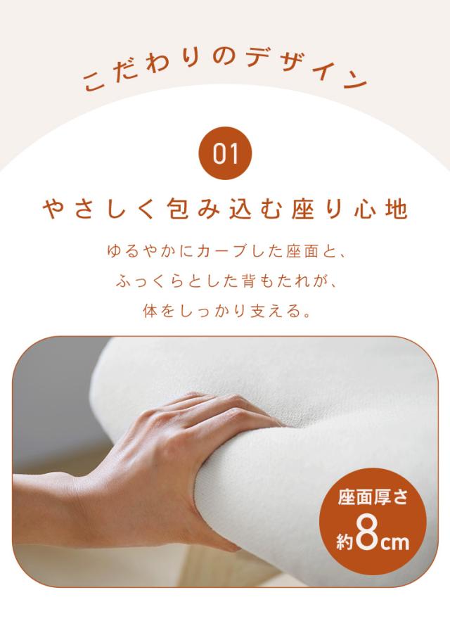 ゆるやかにカーブした座面と、ふっくらとした背もたれが体を支えます。
