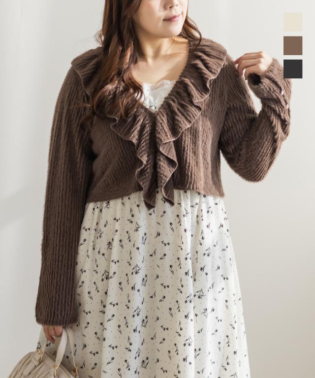 | 3Lサイズを着てちょうどよく窮屈感のない着心地でした。腕周りもピタッとせず着られました。ふわふわの軽いシャギー素材でトップスとしても、羽織のカーデっぽくもスタイリングできます◎短丈なのでスタイルアップ効果も抜群です!ワンピースやハイウエストのボトムと合わせるのがお勧めです。ネックラインはすっきり開いていて、首元が詰まった印象が無く、すっきりと着られます!顔回りを華やかにするさりげないフリルがフェミニンな雰囲気で可愛いです!寒い時期は中にタートルネックなどをレイヤードすると長くお使いいただけます♪ |
