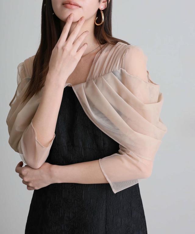 立体感のあるドレープチュールが肩まわりを包み込み、上品で華やかな印象に。