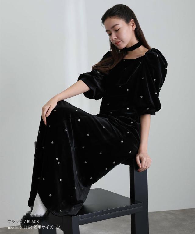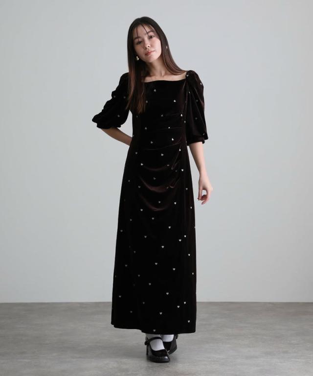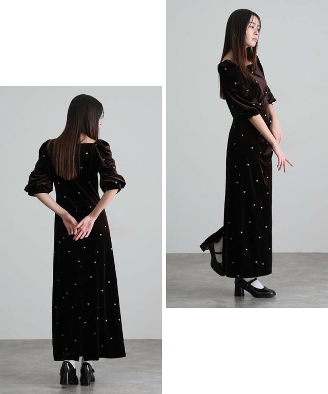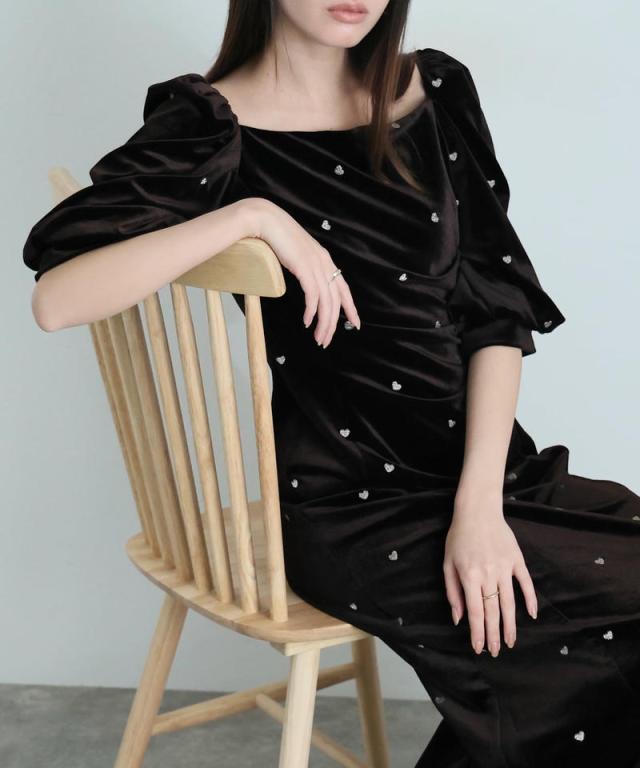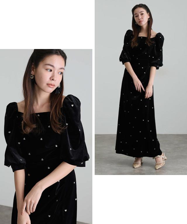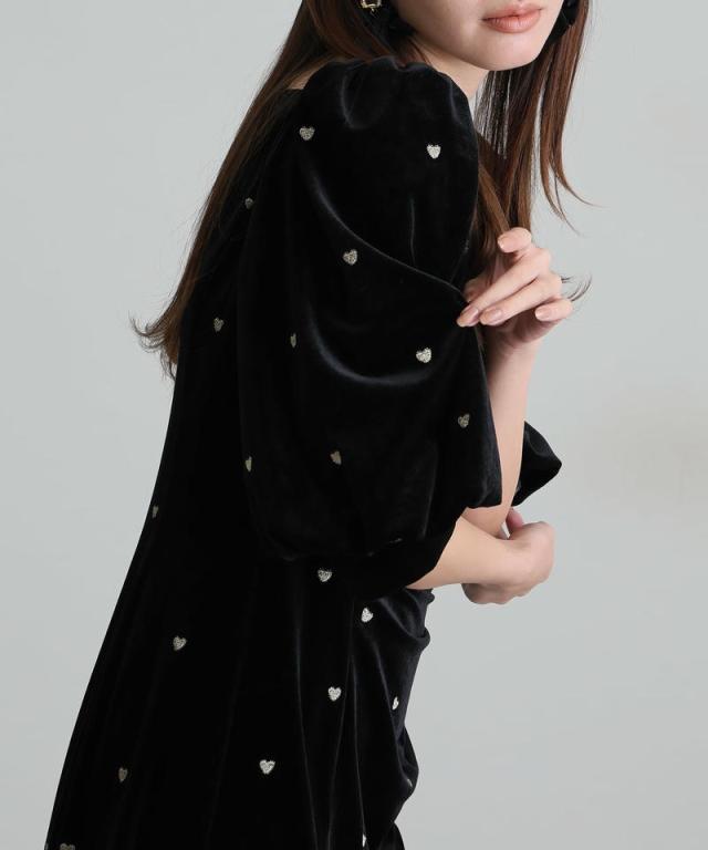 ドレス全体に散りばめられたハートがフェミニンな雰囲気に。