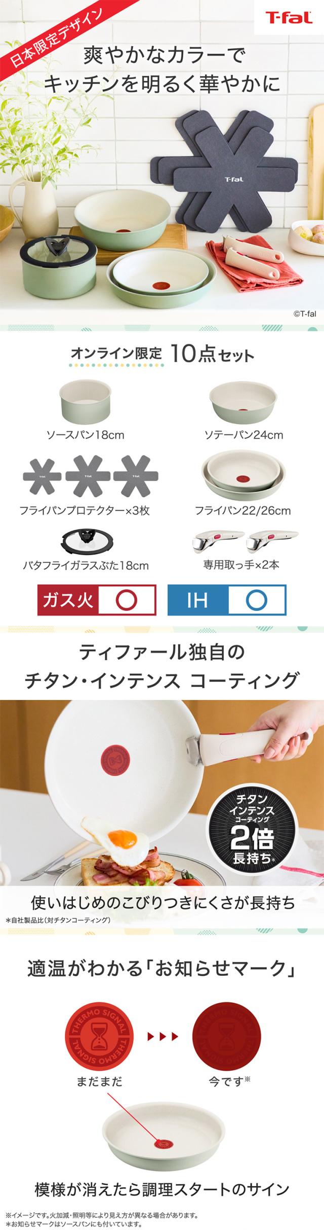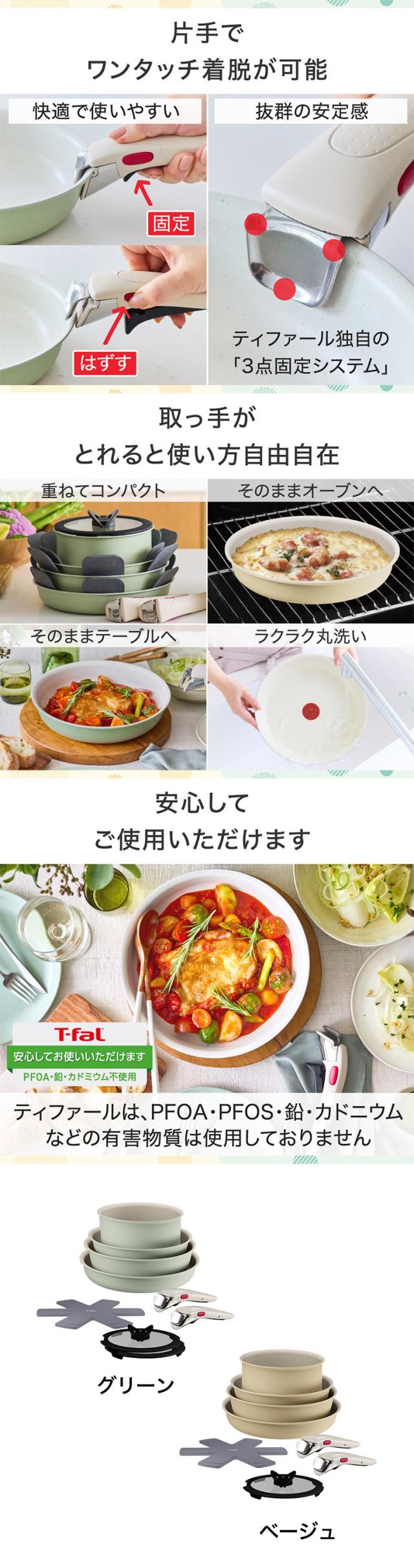 マルチに使える深型フライパンが入ったティファール10点セット。人気のくすみパステルカラー。取っ手の取れる フライパン 調理器具 キッチン用品 キッチンツール tfal
