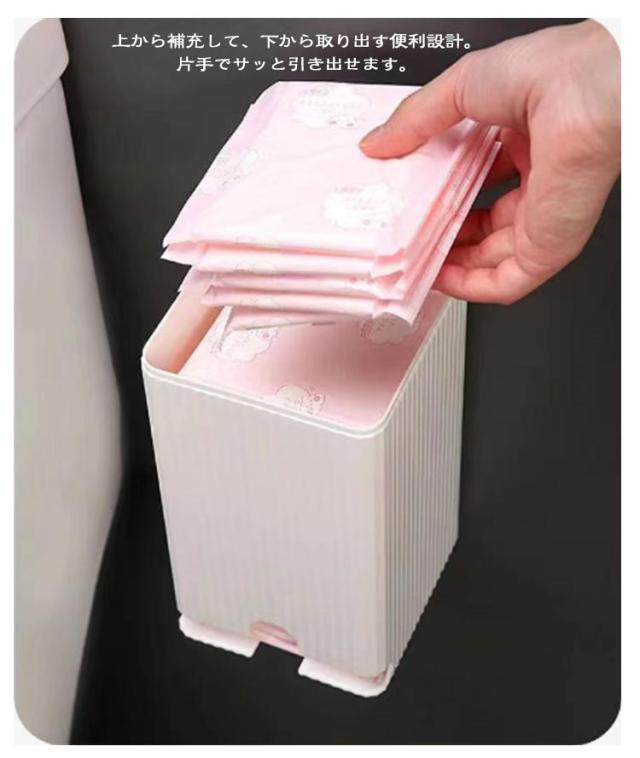 | 置いても、壁に付けても使える!見られたくないサニタリー用品をおしゃれに収納! 上から補充して、下から取り出す便利設計。片手でサッと引き出せます。 防水タイプの強力粘着フックが付属していますので、壁に取り付けができます。工具もいらず取り付けが簡単です。 容量が大きいのでティッシュやゴミ袋などの小物収納としても使用可能! | |