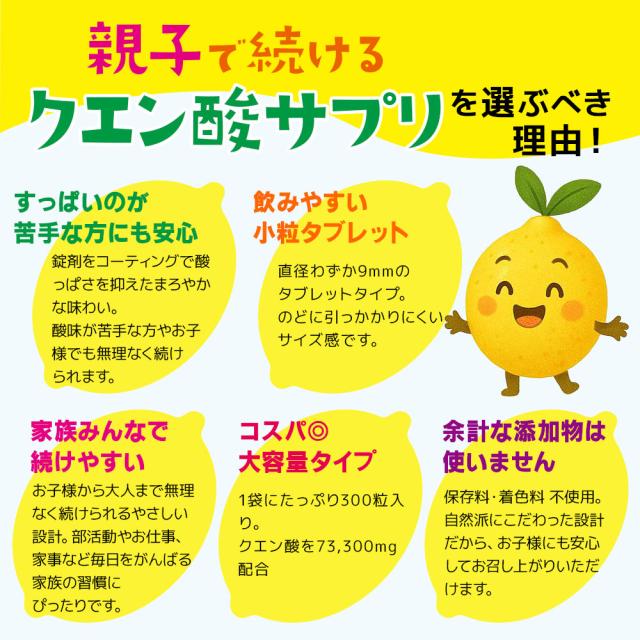 クエン酸 サプリ 親子で続ける 300粒 73,300mg 酸味を抑えた クエン酸 飲みやすい 子供 大人 サプリメント 60〜100日分
