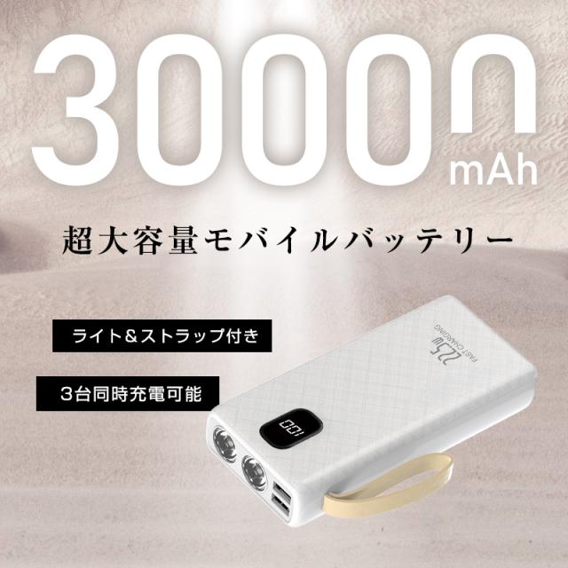 モバイルバッテリー 30000mAh 111Wh 超大容量 ライト付き 懐中電灯型 3台同時充電 PD 22.5W 急速充電 Type-C入力/出力 USB-Aポート*2 軽量 iPhone16/17充電 タブレット/ノートPC充電対応 最新モデル 防災電源 PSE認証済み 90日安心保証付き【PL保険加入済み製品・安心】