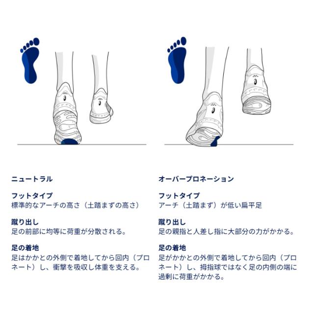 なお、アンダープロネーションに対応しているアシックスの商品は、足部が外方向に回転する動きである