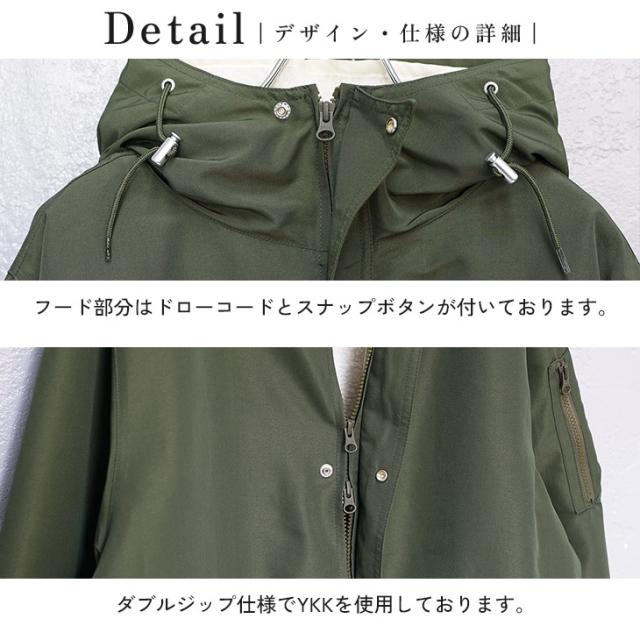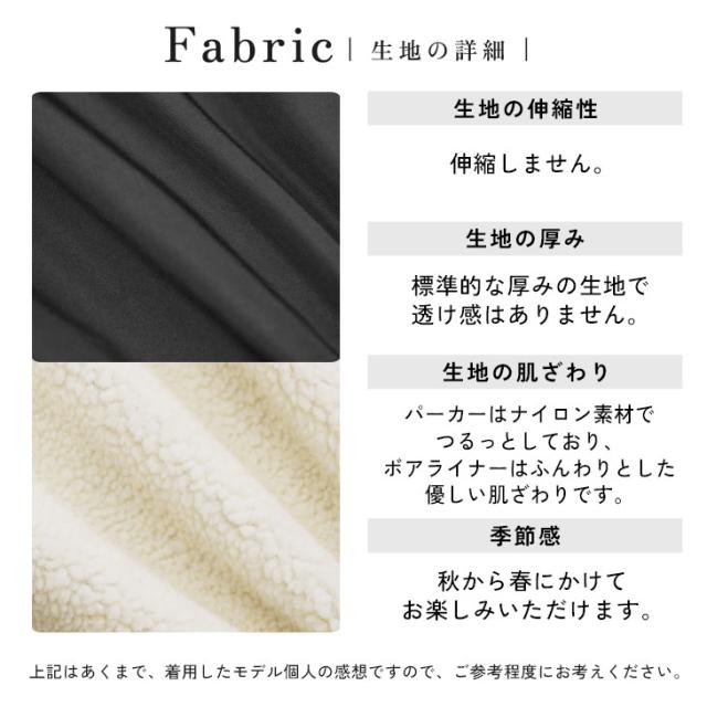 パーカー部分はナイロンを裏地には起毛がかったボア素材を使用し、ジップは滑らかさが特徴のYKKジップを使用し、他にも袖のマジックテープや首を包み込めるスタンドネックなど冷気をシャットアウトできるアイテムです。
