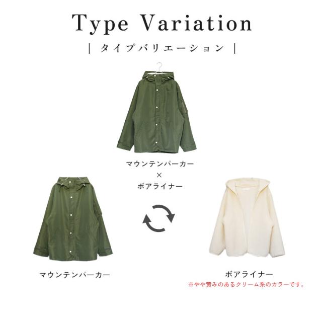 裏地に取り外しが可能なボアライナーを採用したマウンテンパーカー。寒さの厳しい冬はマンパとライナーを合わせてしっかりと防寒性を高め、春や秋など軽いアウターで調節したときにはパーカー部分だけで着用することでロングシーズン使えるアウターです。またライナー単体でも着用でき、室内でのルームウェアや、ちょっとしたお出かけに使えるワンマイルウェアとして重宝します。