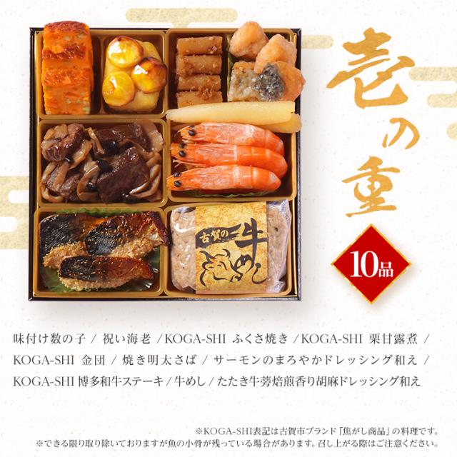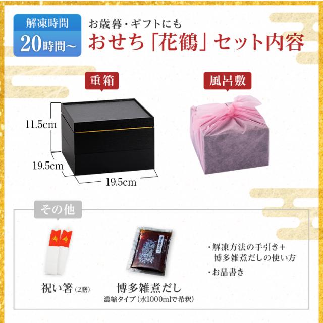 おせち1個 祝い箸2膳 博多雑煮だし(5〜6杯分)1パック お品書き・解凍方法1部 風呂敷1枚 |