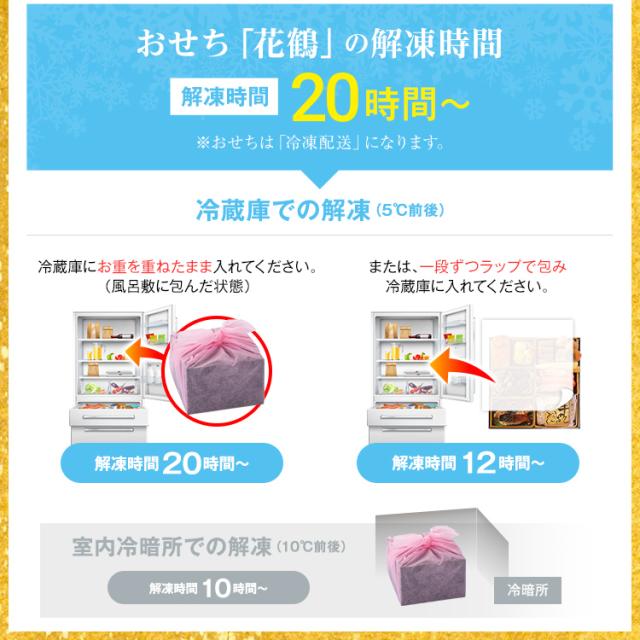 【消費期限】解凍後に冷蔵保存で2日間 【賞味期限】解凍せずに冷凍保存で1月14日まで おせちは生ものです。日持ちのしない食材を含め、様々な具材がありますので開封後はできるだけ早めにお召し上がりください。 |