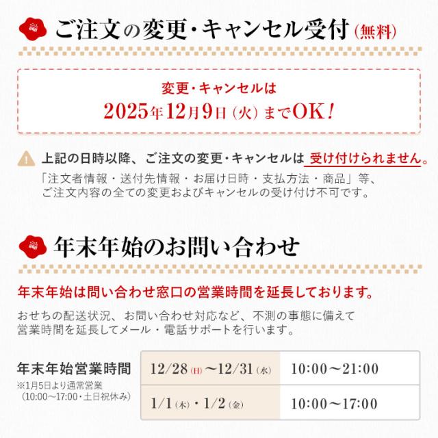 12月28日、12月29日、12月30日、12月31日のいずれか ご選択された日程にお届け予定 ※天候や交通事情等により、お届けに遅れが発生する場合がございます。あらかじめご了承ください。 ※配送状況は発送完了メールにてご確認ください。 |