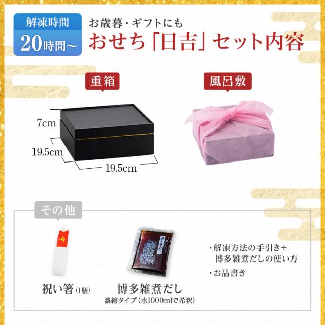 おせち1個 祝い箸1膳 博多雑煮だし(5〜6杯分)1パック お品書き・解凍方法1部 風呂敷1枚 |