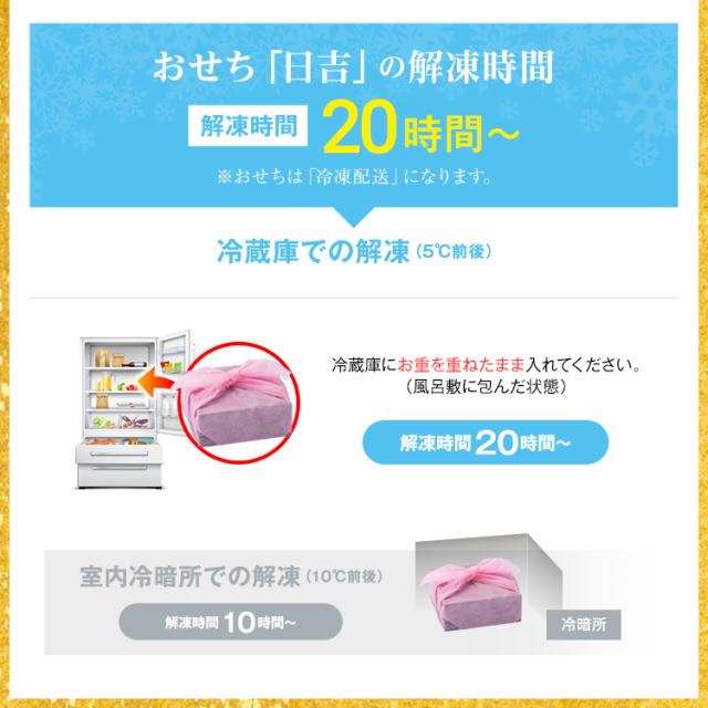 【消費期限】解凍後に冷蔵保存で2日間 【賞味期限】解凍せずに冷凍保存で1月14日まで おせちは生ものです。日持ちのしない食材を含め、様々な具材がありますので開封後はできるだけ早めにお召し上がりください。 |