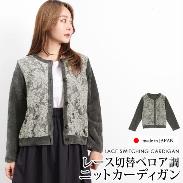 送料無料 カーディガン レディース トップス レース切替 ベロア ニット 日本製 長袖 羽織り 無地 グレー 大きいサイズ LL 3L[57205]
