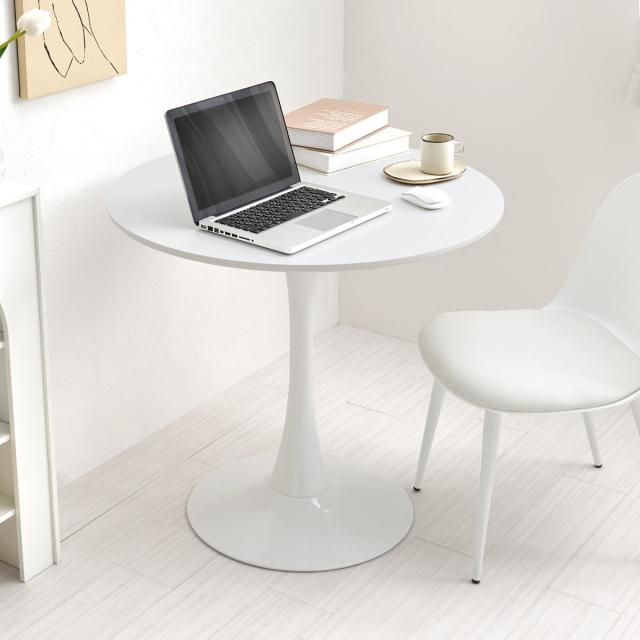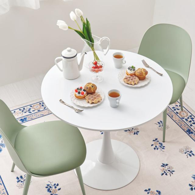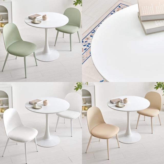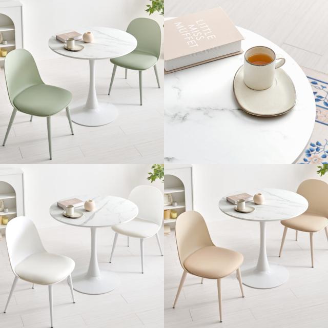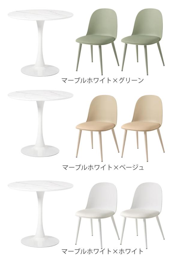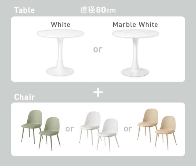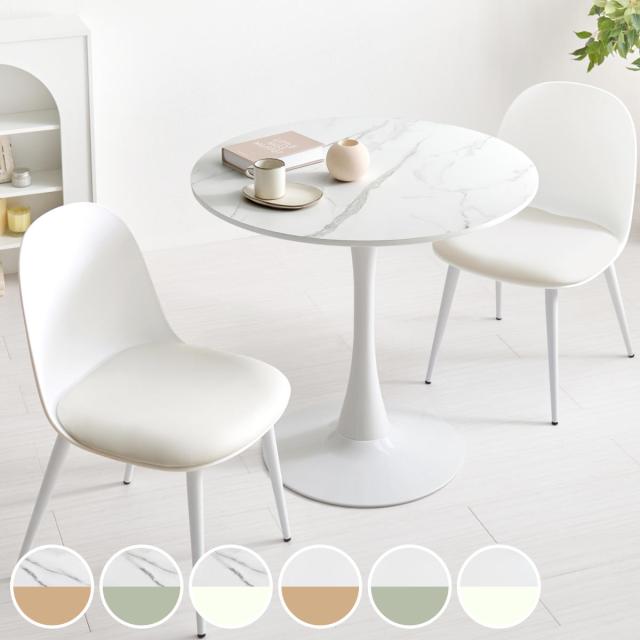 やさしい丸型のカフェテーブルとチェア同色2脚のセットです。テーブル天板は上品なマーブル柄と清潔感のあるホワイトの2種類、チェアはくすみカラーの3色から選択可能。丸い天板と柔らかなフォルムのチェアが空間をやさしく彩り、2人での食事やティータイムを心地よい時間にしてくれます。