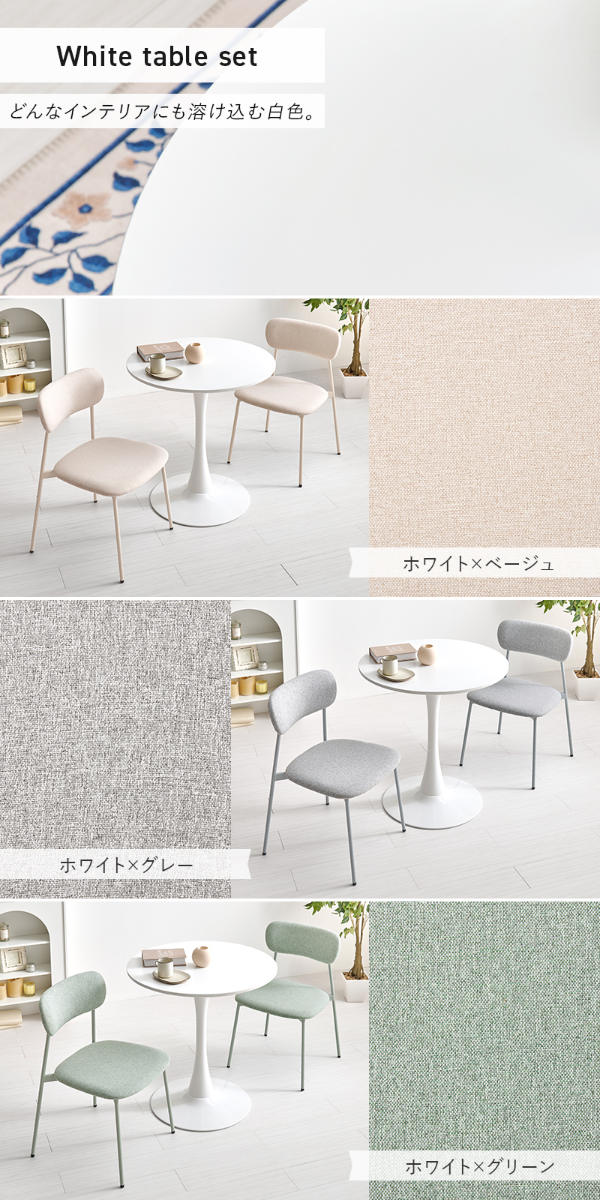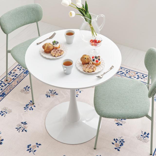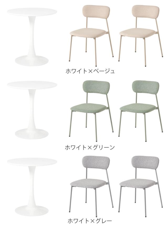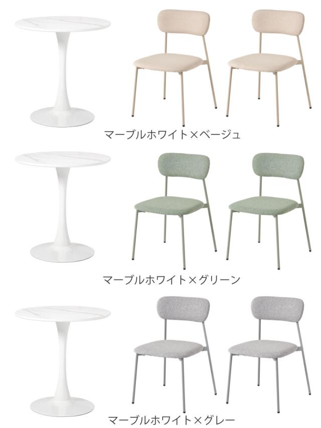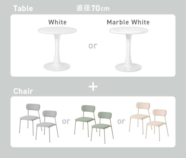 やさしい丸型のカフェテーブルとチェア同色2脚のセットです。テーブル天板は上品なマーブル柄と清潔感のあるホワイトの2種類、チェアはくすみカラーの3色から選択可能。丸い天板と柔らかなフォルムのチェアが空間をやさしく彩り、2人での食事やティータイムを心地よい時間にしてくれます。