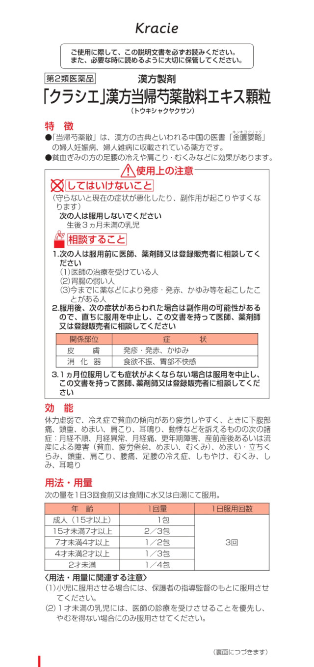 商品名 第2類医薬品 「クラシエ」漢方当帰芍薬散料エキス顆粒 45包 容量 45包 JANコード 4987045047695 メーカー クラシエ カテゴリー 医療・介護・医薬品>医薬品>漢方薬>漢方薬【第一・二類医薬品(指定第二医薬品含む)】 効果・効能 体力虚弱で、冷え症で貧血の傾向があり疲労しやすく、ときに下腹部痛、頭重、めまい、肩こり、耳鳴り、動悸などを訴えるものの次の諸症:月経不順、月経異常、月経痛、更年期障害、産前産後あるいは流産による障害(貧血、疲労倦怠、めまい、むくみ)、めまい・立ちくらみ、頭重、肩こり、腰痛、足腰の冷え症、しもやけ、むくみ、しみ、耳鳴り 用法・用量 1日3回食前または食間に水または白湯にて服用。