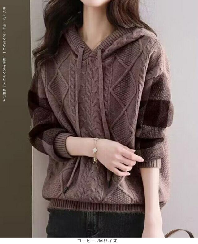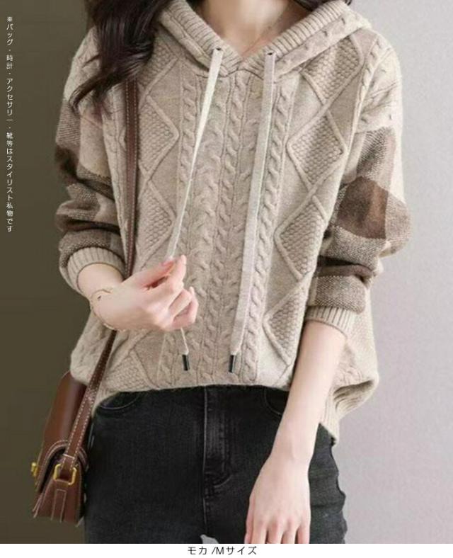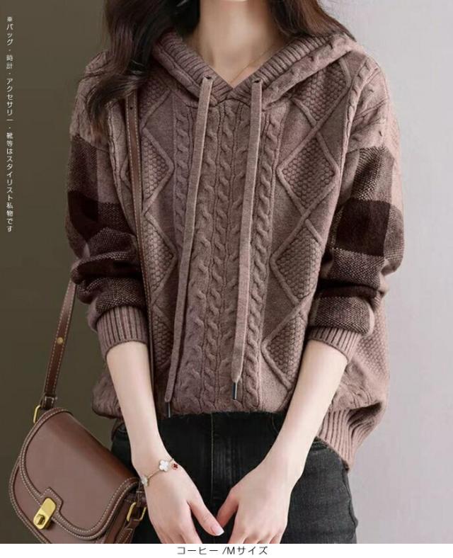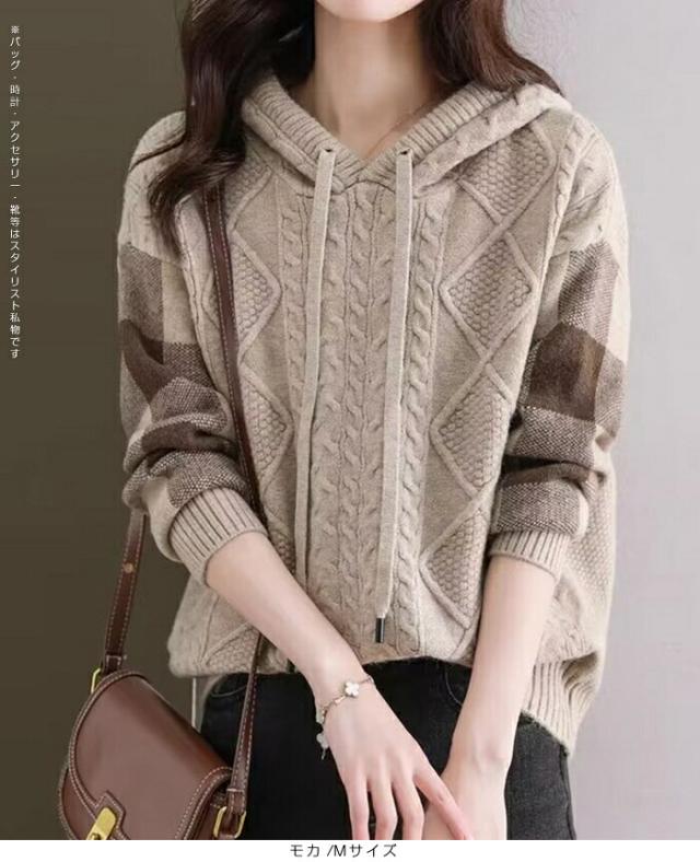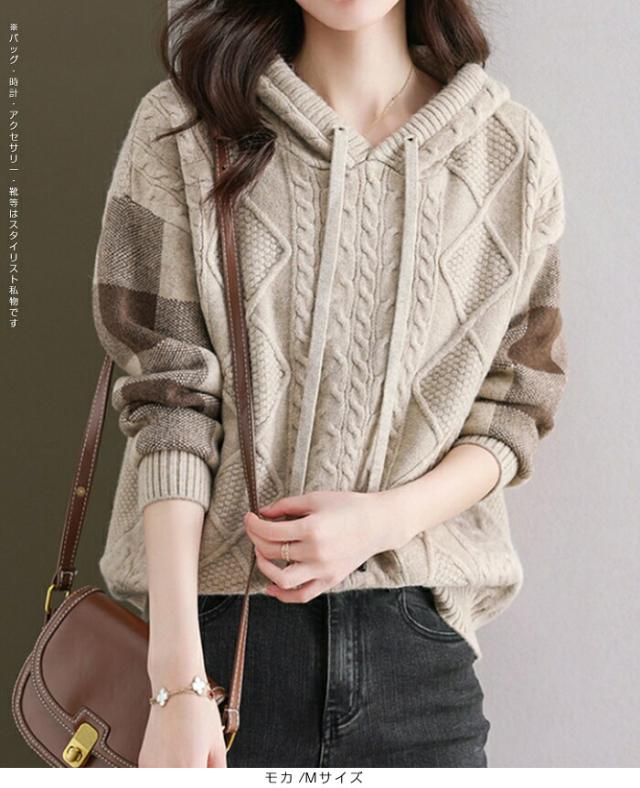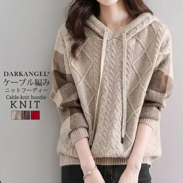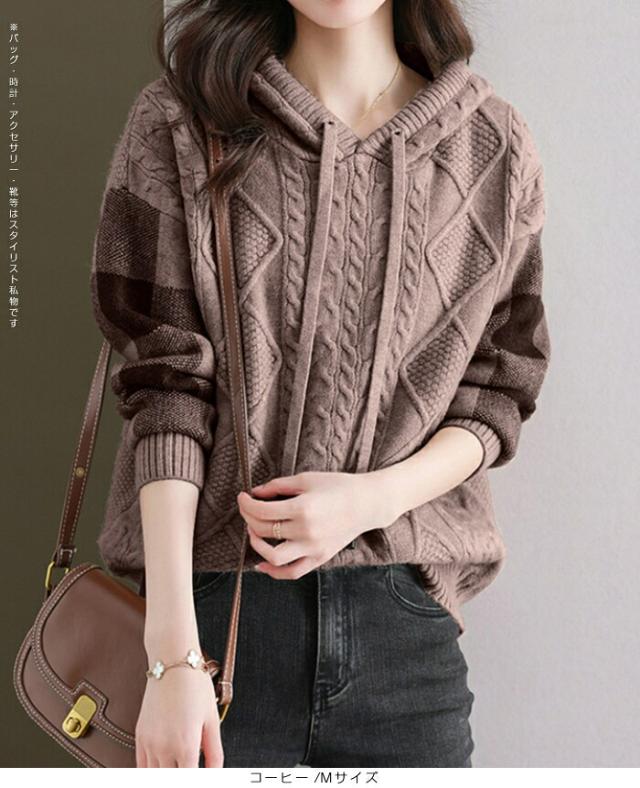 〈2,190円!クーポン利用で〉トップス ニット フーディー レディース 秋 冬 長袖 ニットフーディー ニットパーカー パーカー チェック ケーブル編み ドロップショルダー 体型カバー 着映え 着回し 【ケーブル編みニットフーディー】