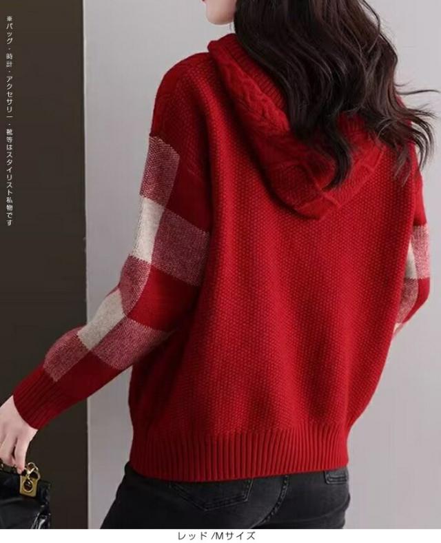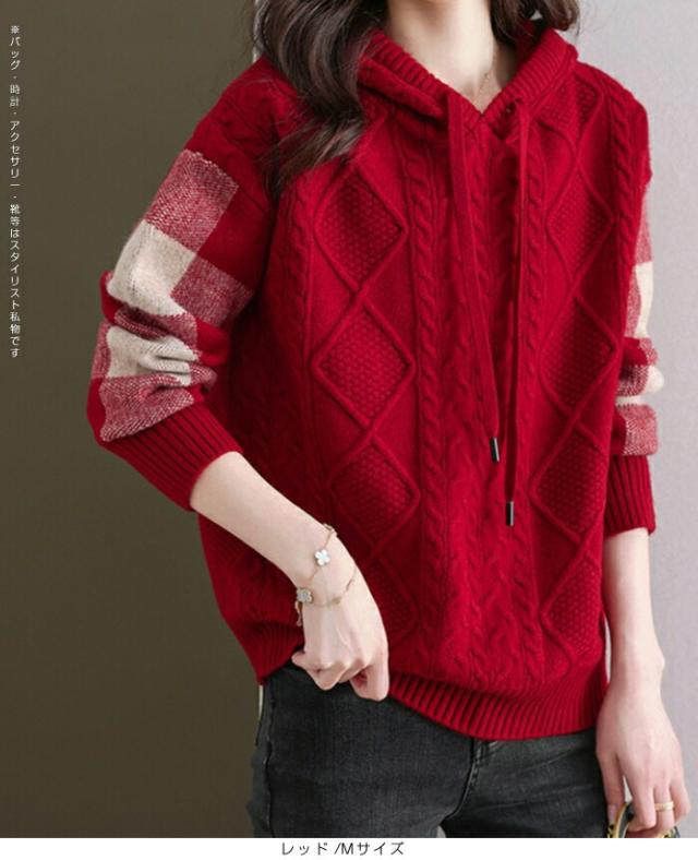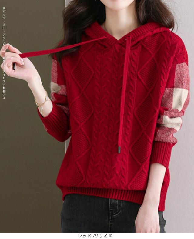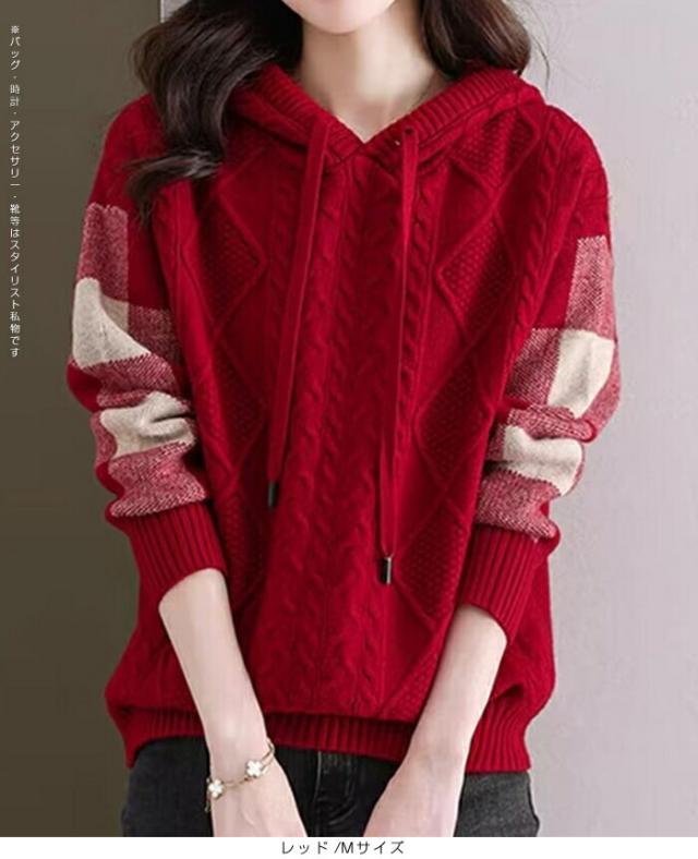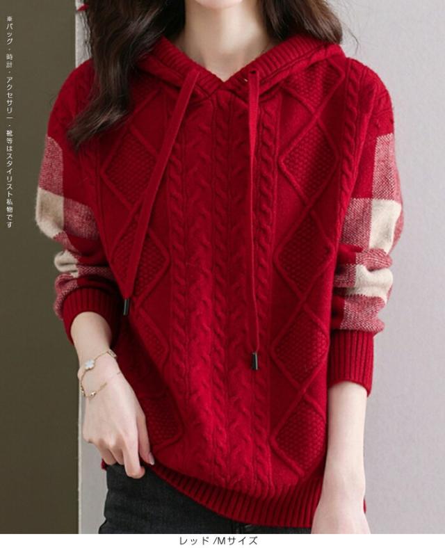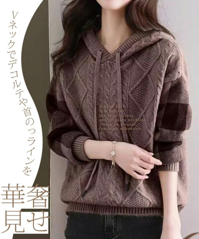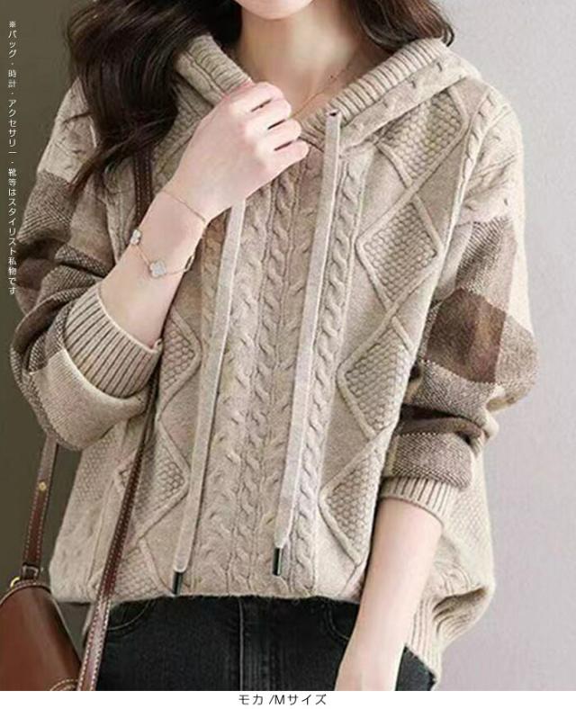 〈2,190円!クーポン利用で〉トップス ニット フーディー レディース 秋 冬 長袖 ニットフーディー ニットパーカー パーカー チェック ケーブル編み ドロップショルダー 体型カバー 着映え 着回し 【ケーブル編みニットフーディー】
