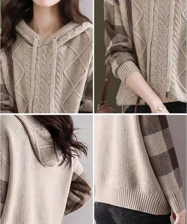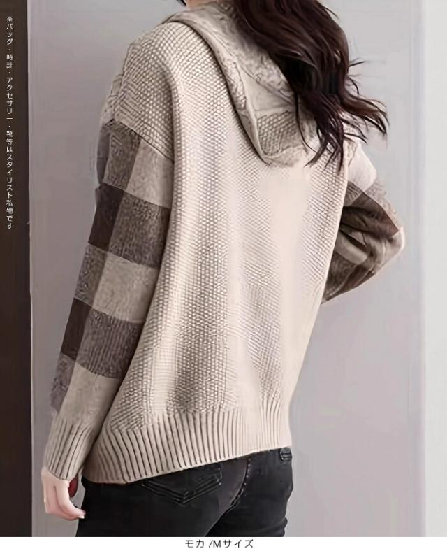 1枚でコーデの主役に。ケーブル編みと袖のチェックが目を引くフード付きニット。