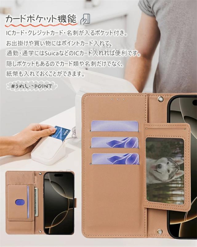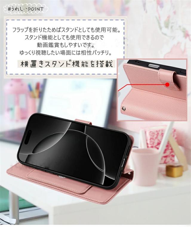 ● 横置きスタンド機能付きで、手持ちでも置きたいときにも快適です。br>● 内側には5つのカード入れがついており、名刺・交通系ICカード・紙幣などを入れられるのが特徴です。