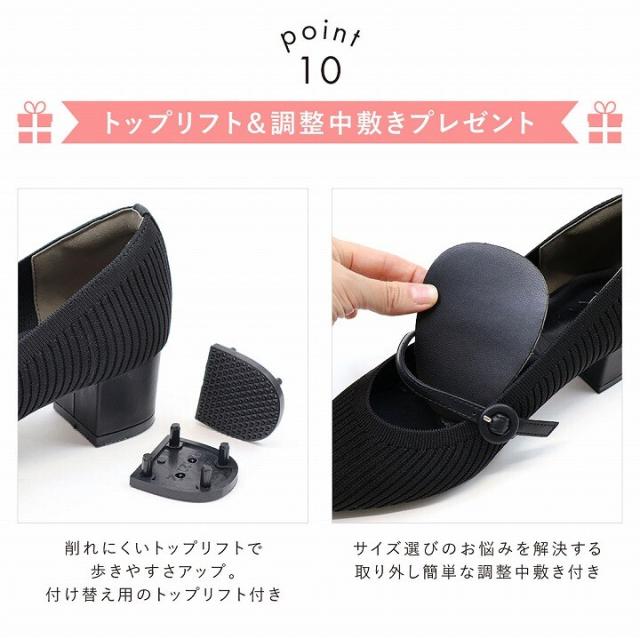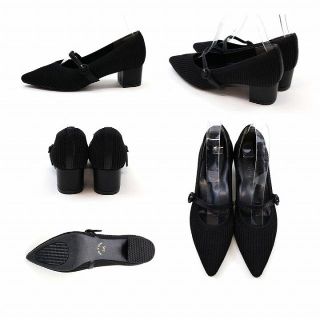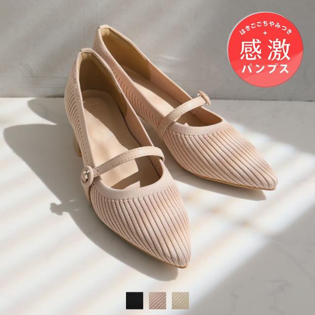 26春夏新作:22.5−24.5cm対応4cmヒールポインテッドトゥメリージェーン感激ニットパンプス