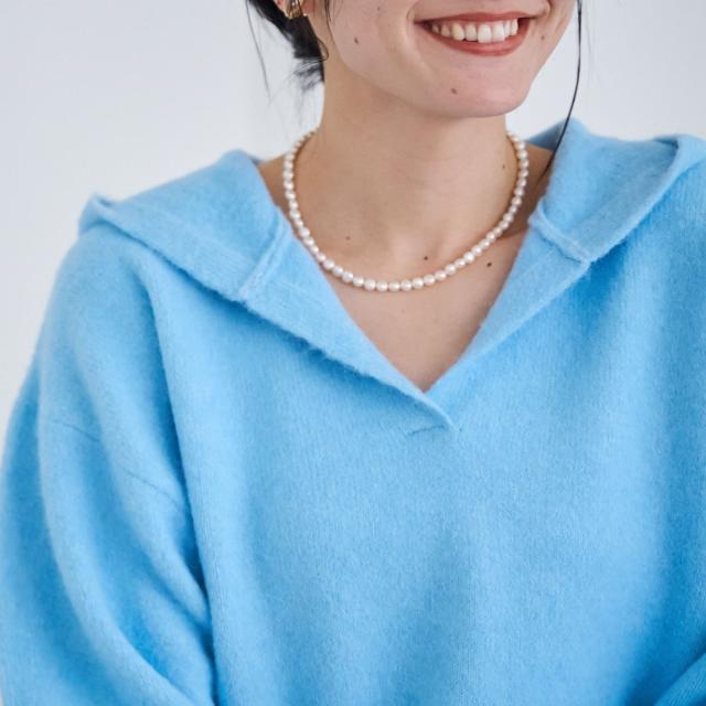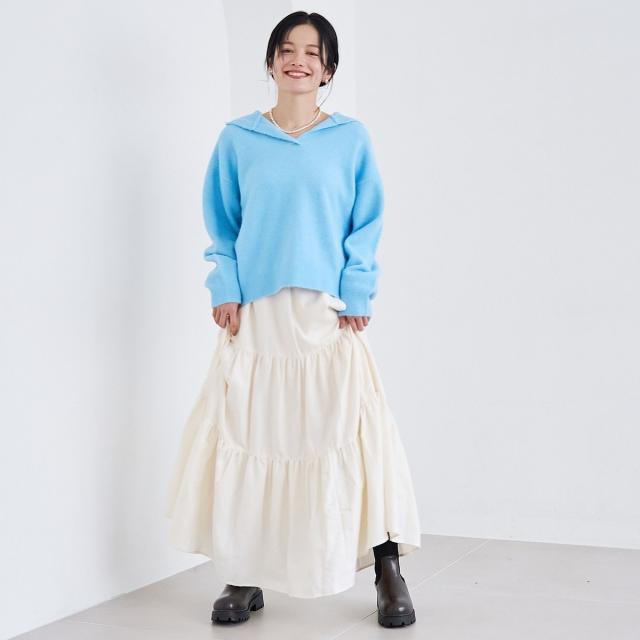 ボタンやジップのない“V字に開いた襟元”=スキッパー仕様で、抜け感と小顔見えを叶えます。