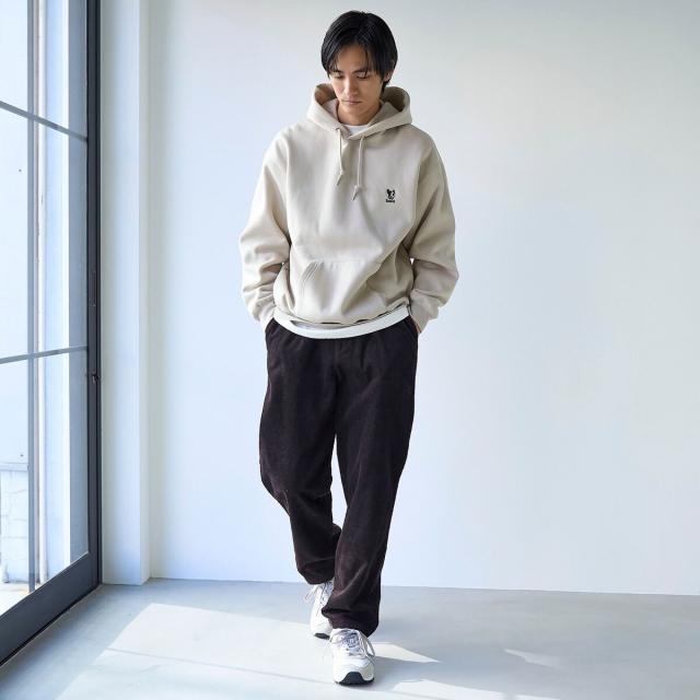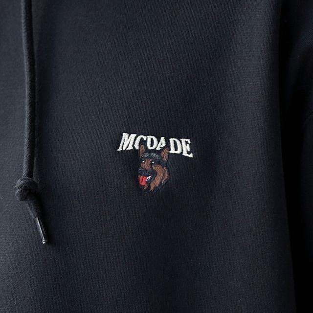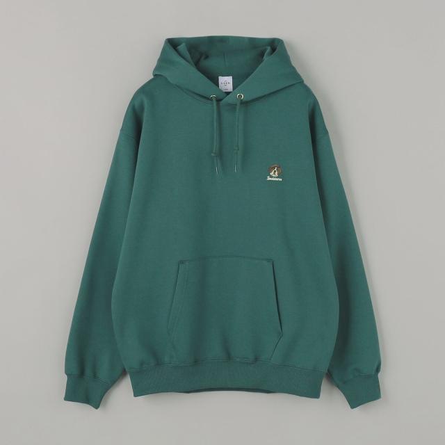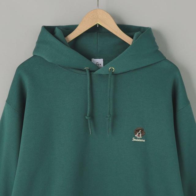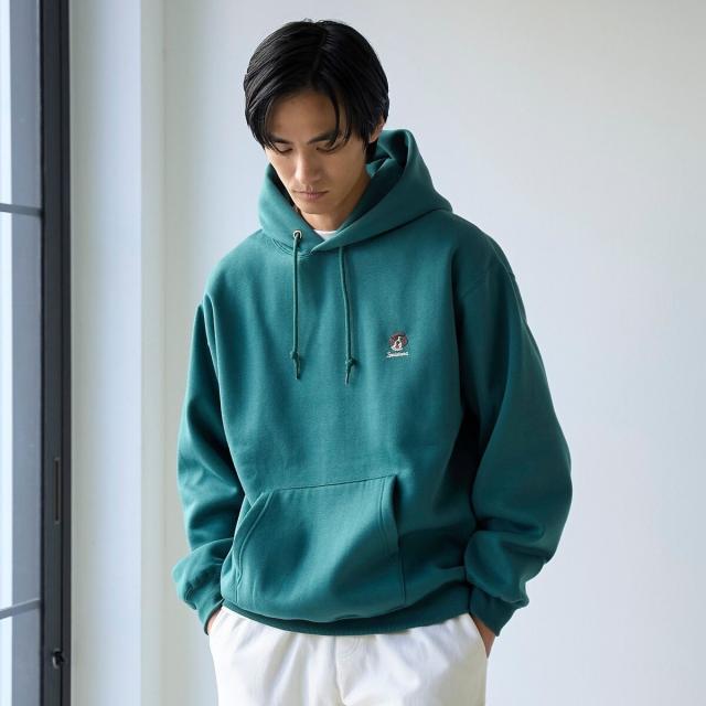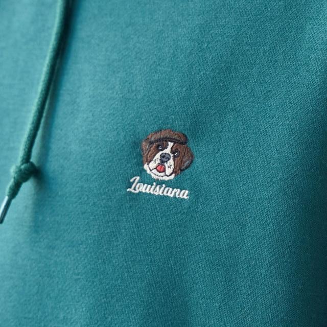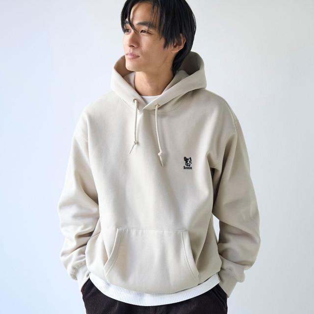 ヘッドホンや蝶ネクタイを付けた犬の刺繍が胸元に施され、さりげない遊び心を効かせたプルオーバーパーカー。