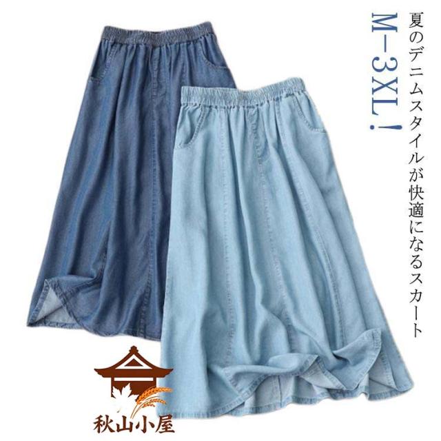 | M-3XL!夏のデニムスタイルが快適になるスカート キレイなフレアAラインが大人女の子の魅力を高めてくれる! ストレッチ入りで楽ちんなのが嬉しい!夏にピッタリの薄くて軽いデニム生地! 柔らかく、肌触わりの良い素材を使用、接触冷感がるのひんやりデニム素材が今年らしい! ウェストは総ゴム仕様なので、一日着いているも疲れない、スチレスフリーな着心地です。 | |