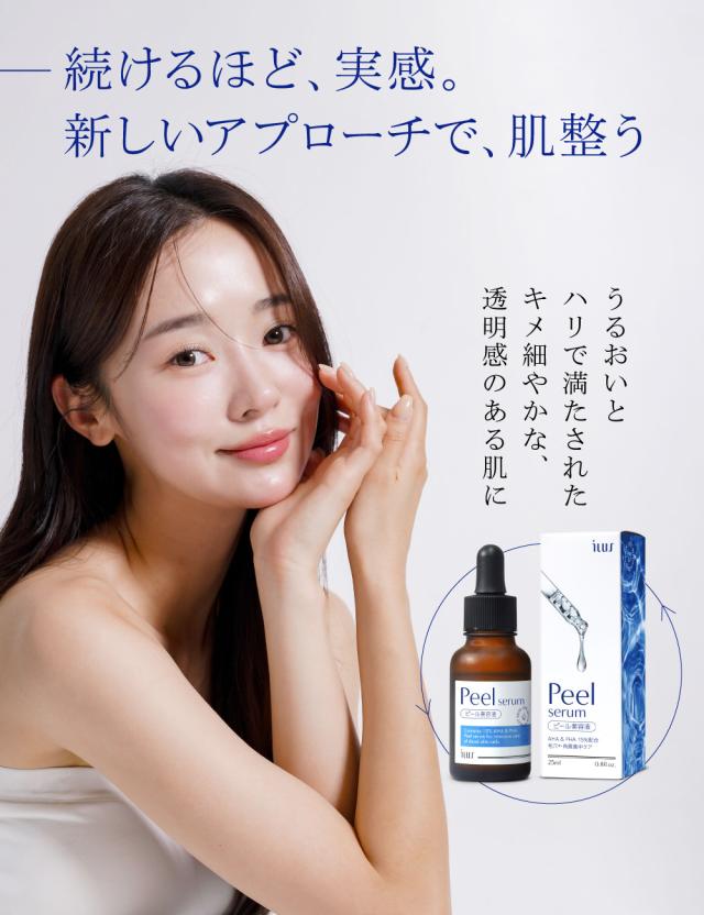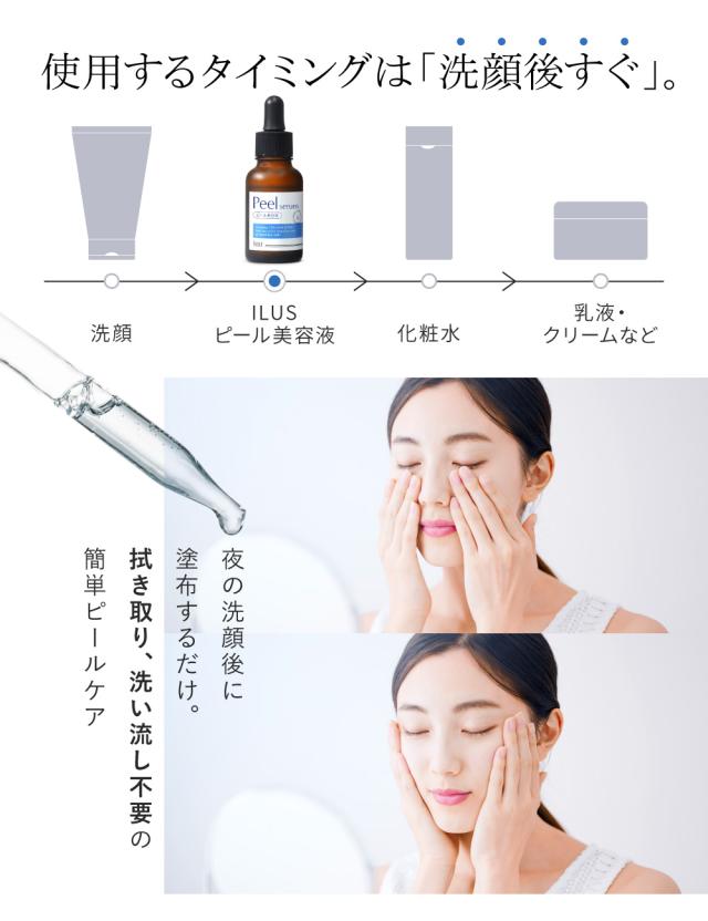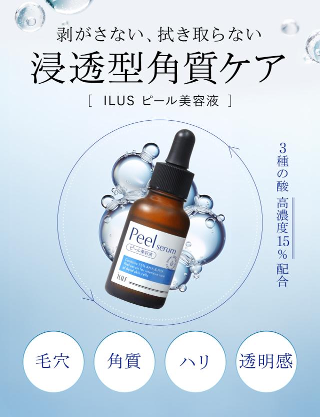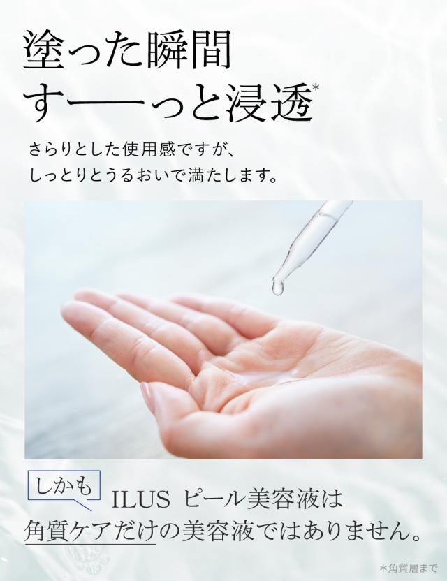 ILUS ピール美容液は、肌をやわらげなめらかにするために特別に設計された3種の酸(マンデル酸(AHA)、ラクトビオン酸、グルコノラクトン(PHA))を高濃度15%配合。毎日生まれ変わる肌のリズムに正しく寄り添い、肌のキメを整えます。