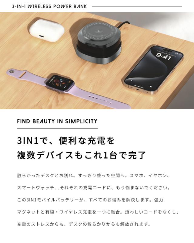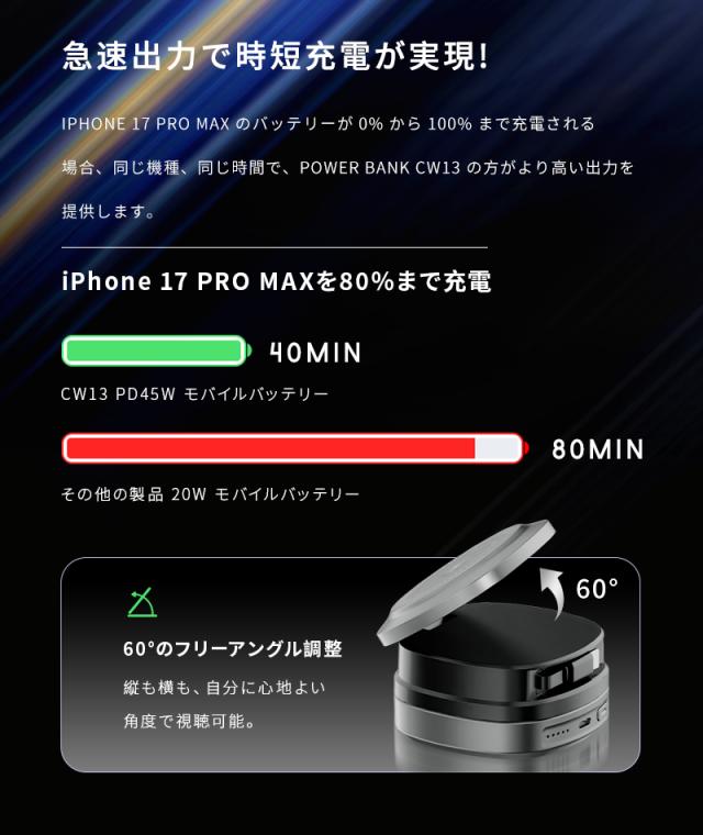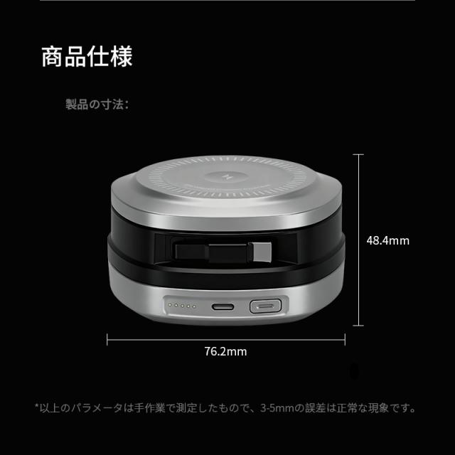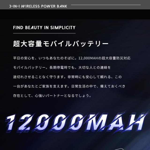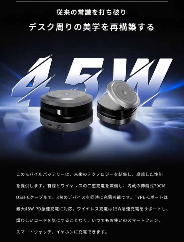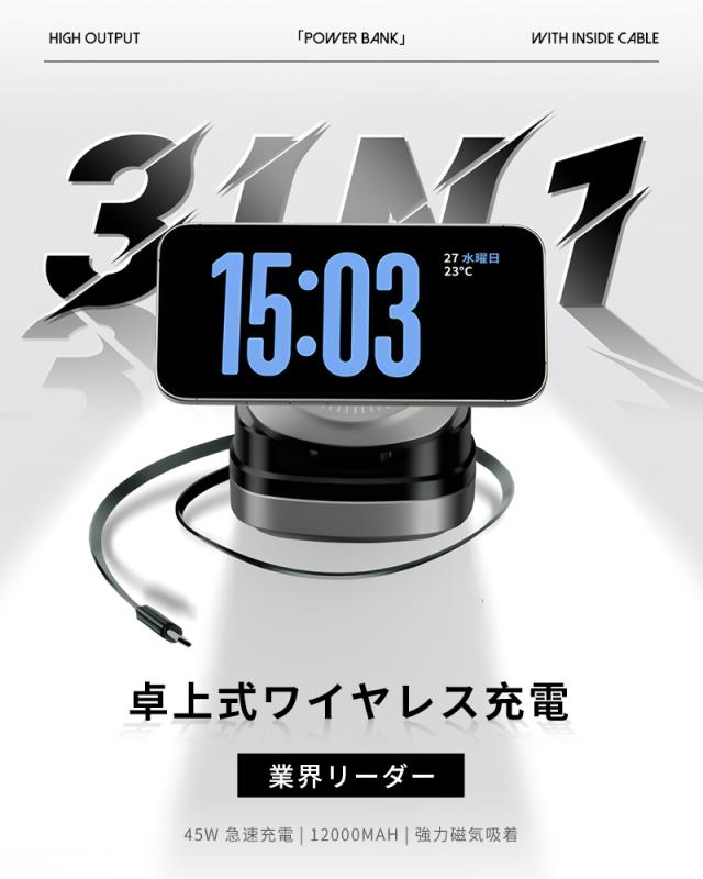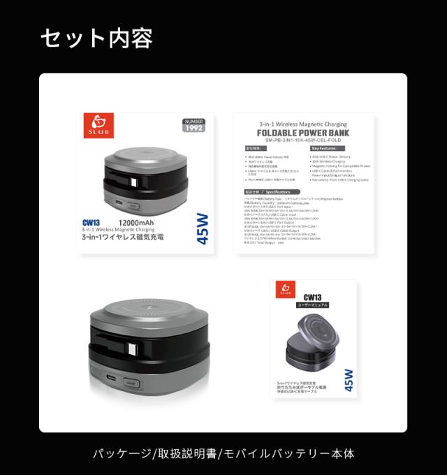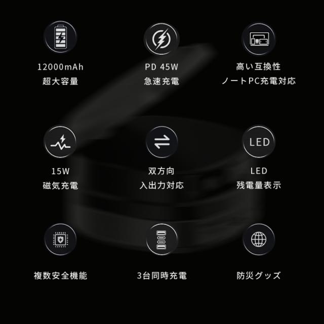 モバイルバッテリー 12000mAh大容量 巻き取り式ケーブル内蔵 iWatch/AirPods磁気充電 MagSafe対応 3台同時充電 iPhone17/16/15/iOS Airpods/アップルウォッチ対応充電 ノートPC充電対応 PD45W 急速充電 コンパクト 携帯便利 防災グッズ PSE認証【PL保険加入済み製品・安心】