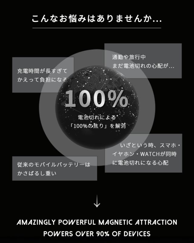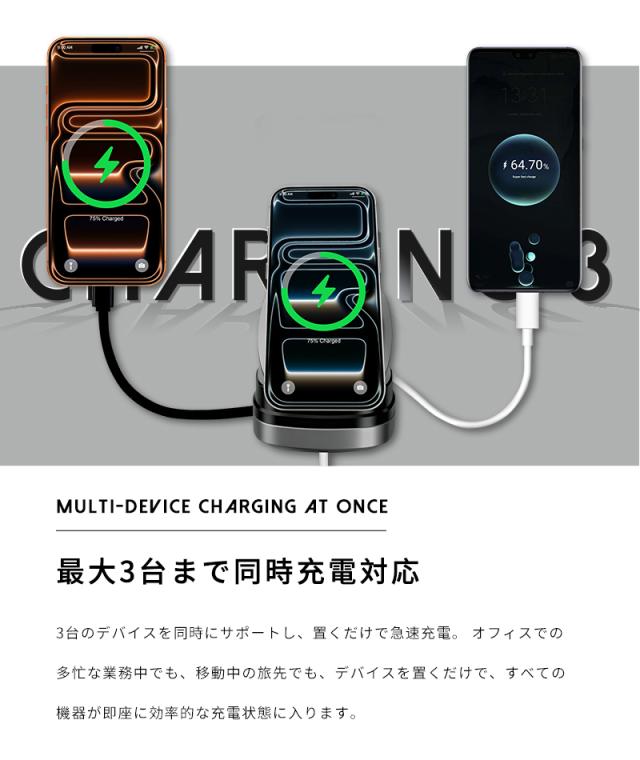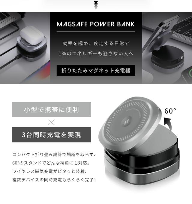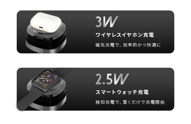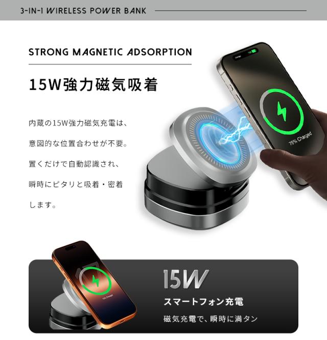 2.強磁気充電パッドは、折りたたみ式、QI規格のスマホ・イヤホン・スマートウォッチなどを置くだけで充電可能。スマートフォン充電時は最大15Wの磁気充電に対応。